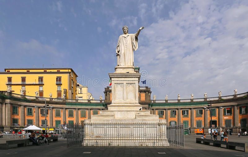 Piazza Dante : Sur l'ancienne place du marché (qui fut durant longtemps la place des exécutions dont celle de Conradin, voir fiche N°437), Charles III roi d'Espagne (de Naples etc voir fiche N°432) demanda à l'architecte Luigi Vanvitelli d'aménager la place à sa gloire. Cette place en demi-cercle accueille au sommet de l'hémicycle 26 statues censées représenter les qualités du roi (rien que ça!) Une statue équestre du roi qui devait occuper le centre de la place ne vit jamais le jour. A ce centre il y eut successivement : un arbre de la Liberté (au temps de la République Parthénopéenne), une statue de Napoléon Bonaparte (sous le règne de Murat et Caroline Bonaparte) puis enfin Dante (statue réalisée en 1871) dont on trouvera la photo en illustration (emprunt au net). Trois églises encadrent la place. Cette place fut restructurée en 2002 à l'occasion des travaux de construction du métro.